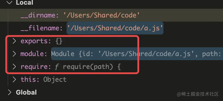 使用require函数作模块的引入,使用exports对象来做模块的导出,这里的require exports正是CommmonJS规范提供的,使用断点调试,可以看到这几个核心变量: