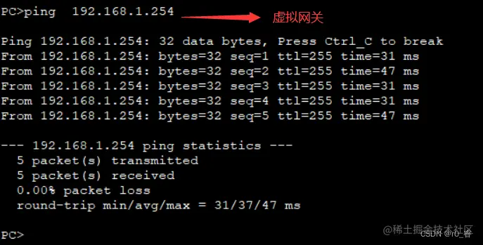 虚拟网关:通过VVRRP虚拟出来的网关IP地址,这个网关IP地址,是配置在终端设备上的;终端设备访问其他网段时,直接将数据发送给虚拟网关IP地址。此时只有master路由器会回应针对虚拟网关的ARP请求,所以最终终端设备发送的数据发送到了master路由器设备上。