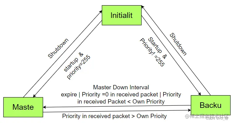 路由器配置号好vrrp协议后,路由器处于初始状态,当物理接口上的IP地址和虚拟ip地址一致,如果一台路由器的优先级为255,则此台路由器自动成为主。如果优先级不等于255,那就先成为备机,观望一下能不能收到其他路由器发来的vrrp报文。