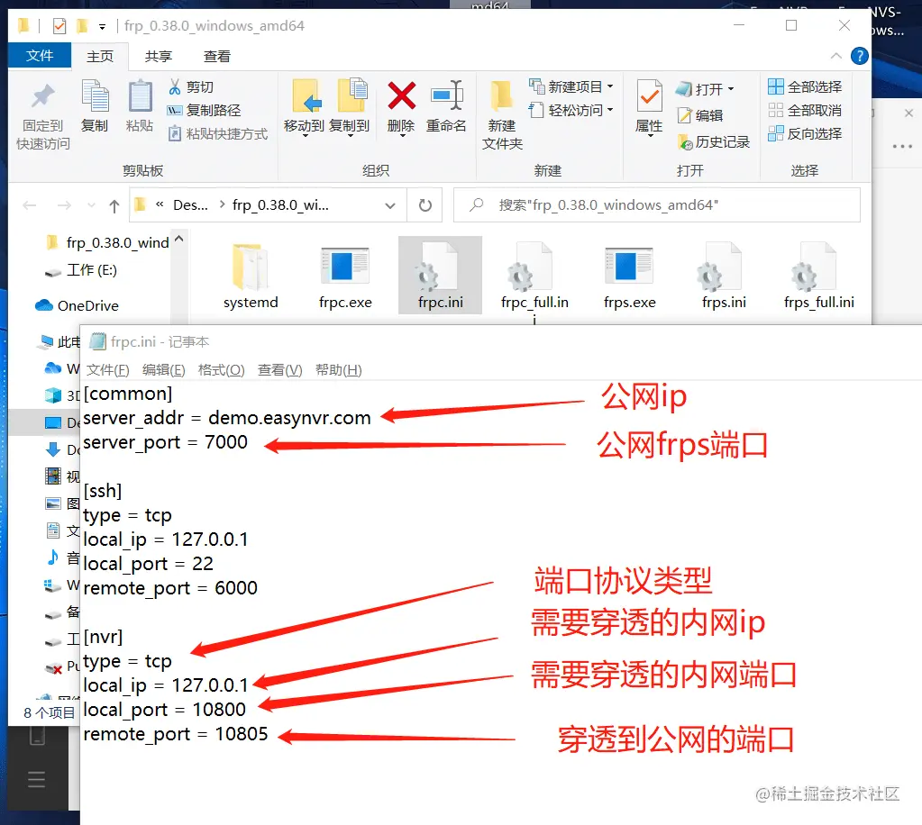 2)在客户端(EasyCVR服务器)安装frpc(内网需要穿透的环境为客户端),并且修改frpc.ini配置文件,具体见下图: