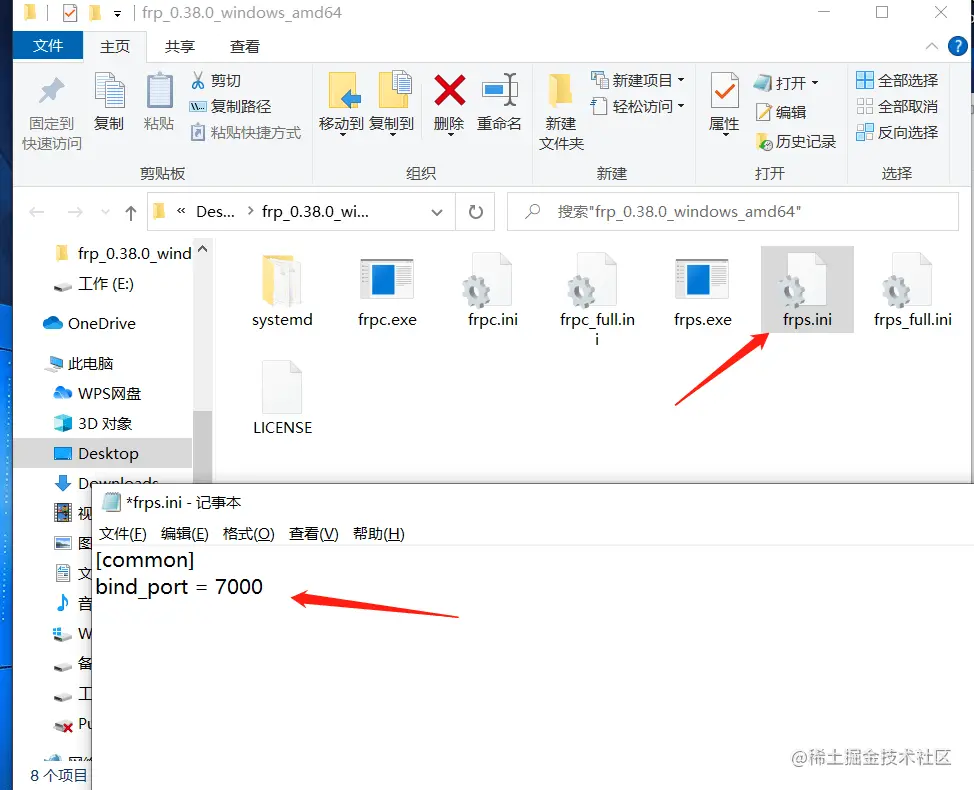 1)在服务器(公网固定ip)下载frp(这里以Windows系统为例),解压下载的压缩包,找到frps.ini文件,修改frps端口为7000;