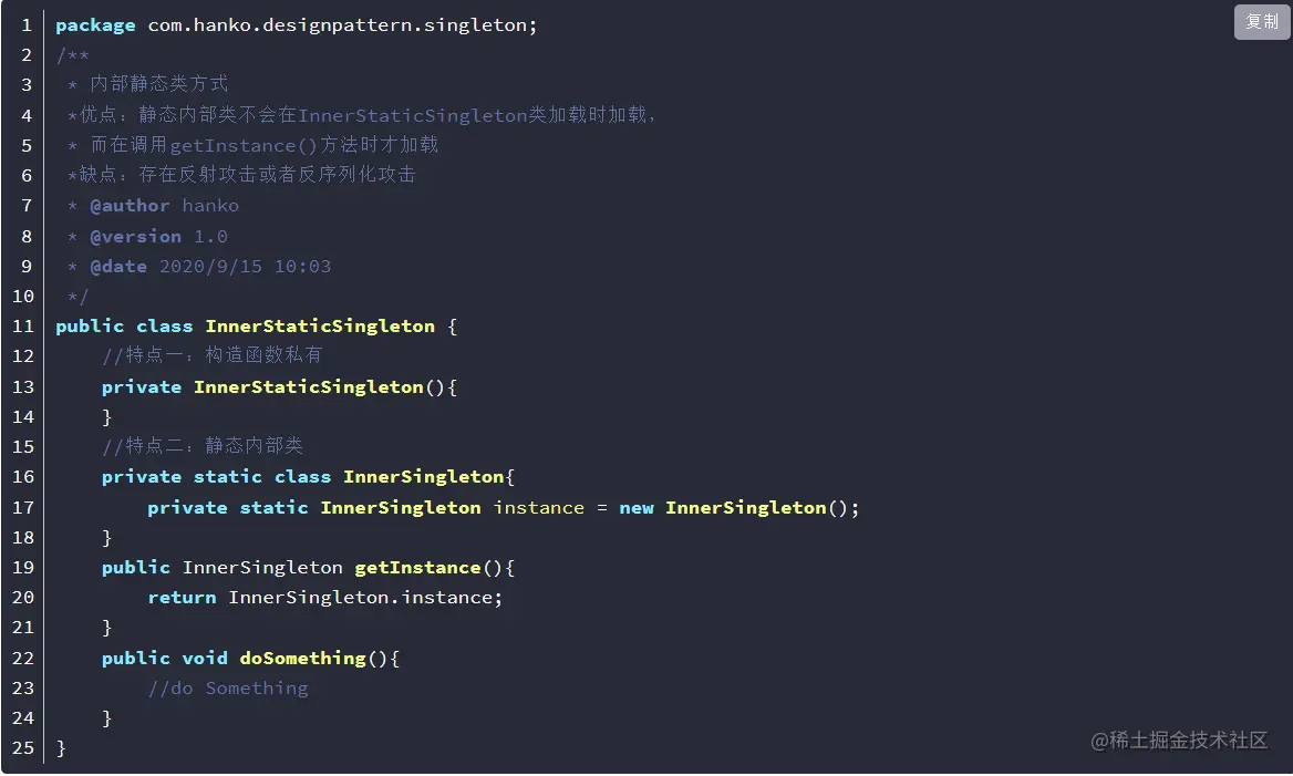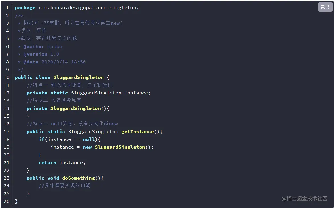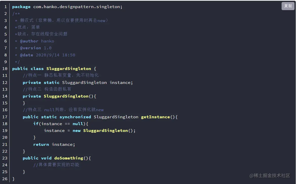 在Java中,单例模式是一种设计模式,它保证一个类只有一个实例,并提供全局访问点以便其他对象可以访问该实例。实现单例模式的关键在于确保只有一个对象被创建并且该对象不会被多次实例化,保证被创建一次,节省系统开销。