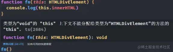 ○但是如果你直接调用 fn 函数的话, 内部的 this 并不是 HTMLDivElement 类型