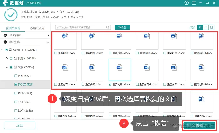 4.深度扫描可能会花较长时间,等待扫描结束,再次选择需要恢复的文件,点击 【恢复】 ,并将恢复后的文件保存在出c盘以外的其他磁盘中。