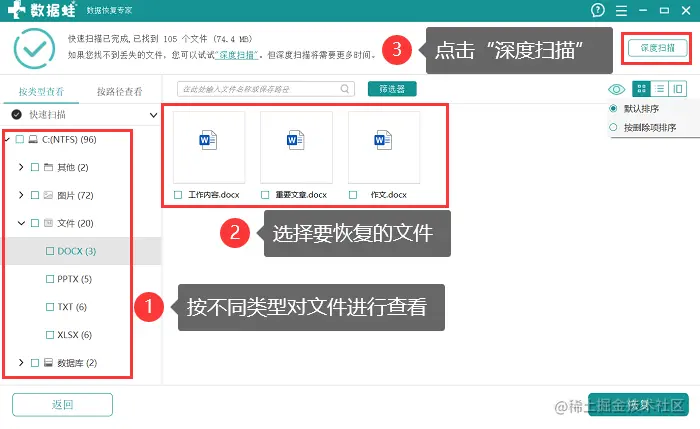 3.等待扫描结果出现,可以在页面左侧选择具体的文件类型,并对文件进行查看,建议点击 【深度扫描】 以获得更详细的扫描结果;