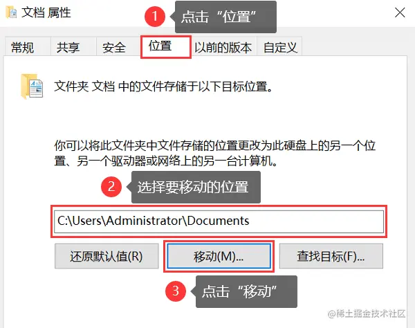 3.单击 【位置】 选项卡,并指定新位置(例如:D盘);