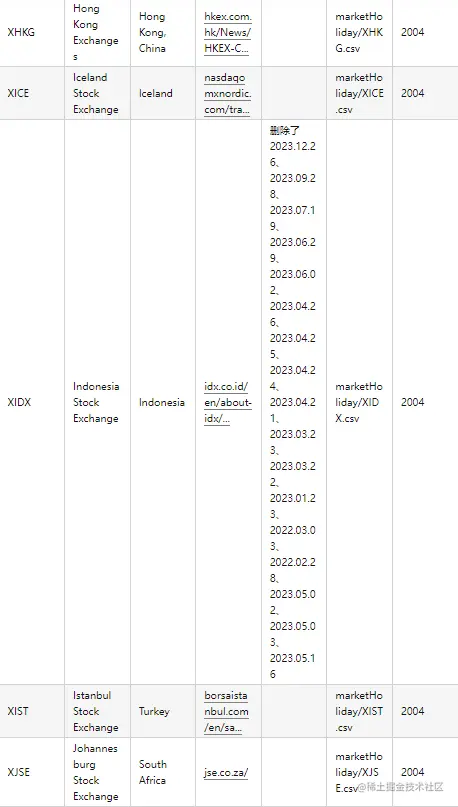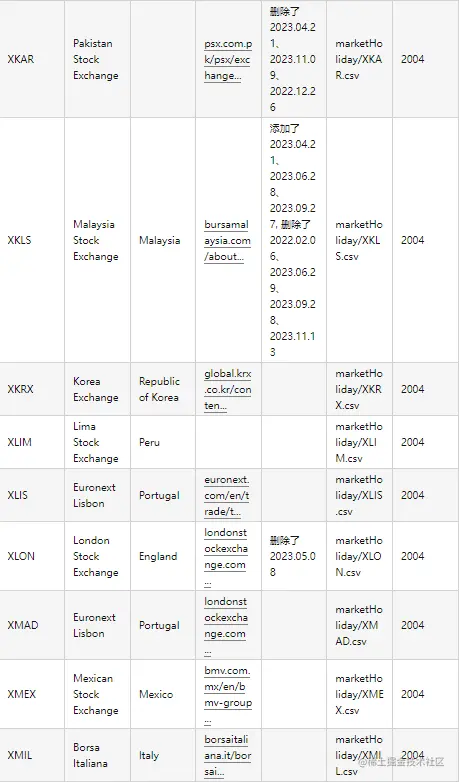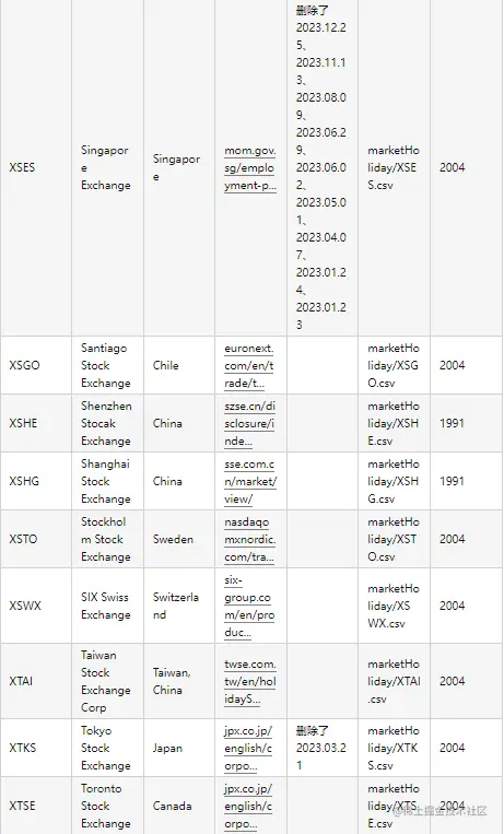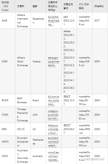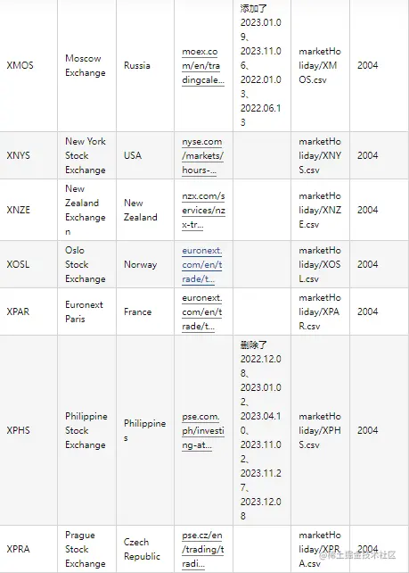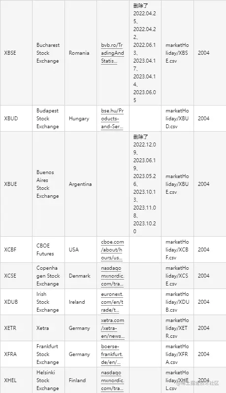 针对世界各国知名交易所(含上交所和深交所),统一采用 ISO Code 作为交易所的标识码。交易日历数据来源于各交易所官网公布的交易所节假日以及各地政府公布的法定节假日公告。