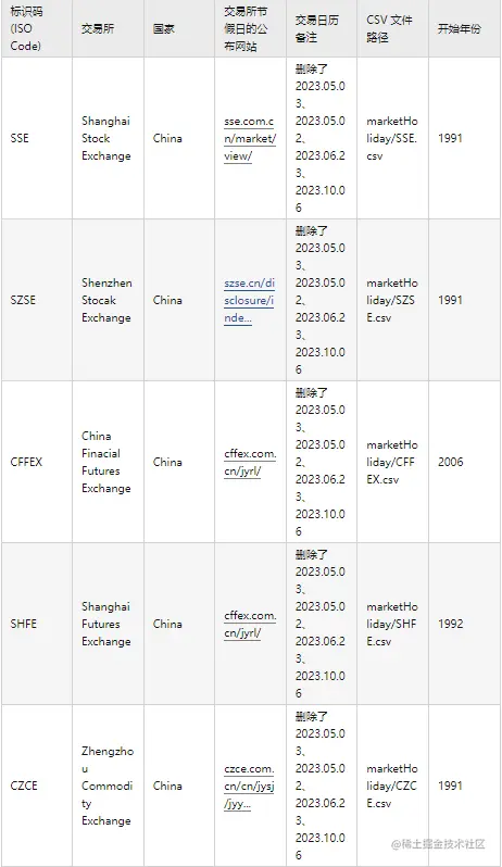 本章里列举了 marketHoliday 目录下的所有交易所的信息。为了方便国内用户使用,除了用交易所的 ISO Code 标识交易所名(交易所 ISO CODE 列表)之外,增加了对国内六大交易所(上交所、深交所、中金所、上期所、郑商所、大商所、上能源)采用国内交易所简称作为标识名(中国交易所简称列表)。