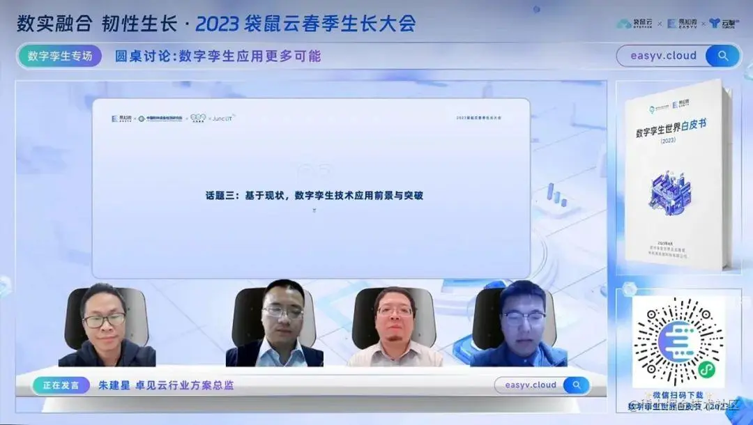 4月20日,以“数实融合,韧性生长”为主题的袋鼠云春季生长大会圆满落幕。本次大会开展了精彩的圆桌会议,在圆桌上,易知微邀请了中国特种设备检测研究院主任&正高级工程师邓贵德、北京中创碳投科技有限公司首席科技官唐进、浙江卓见云科技有限公司行业方案总监朱建星,与袋鼠云联合创始人&易知微CEO宁海元,就**“数字孪生技术、实践应用、挑战与机遇”**三大主题展开了圆桌交流探讨。