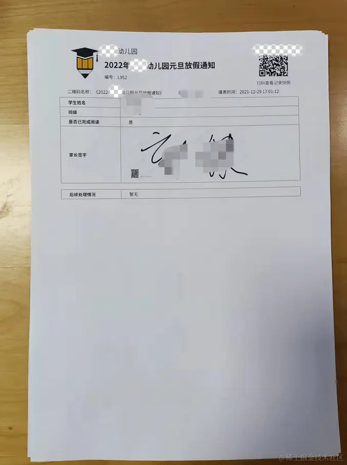 将通知做成一个二维码,码中带上通知文件,以及家长需要填写的信息;