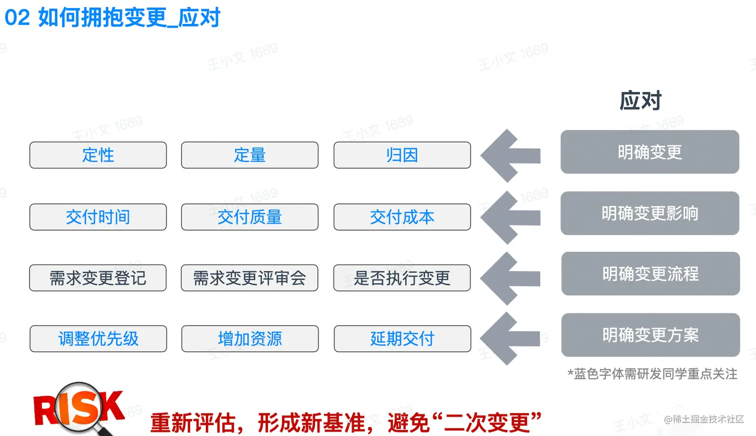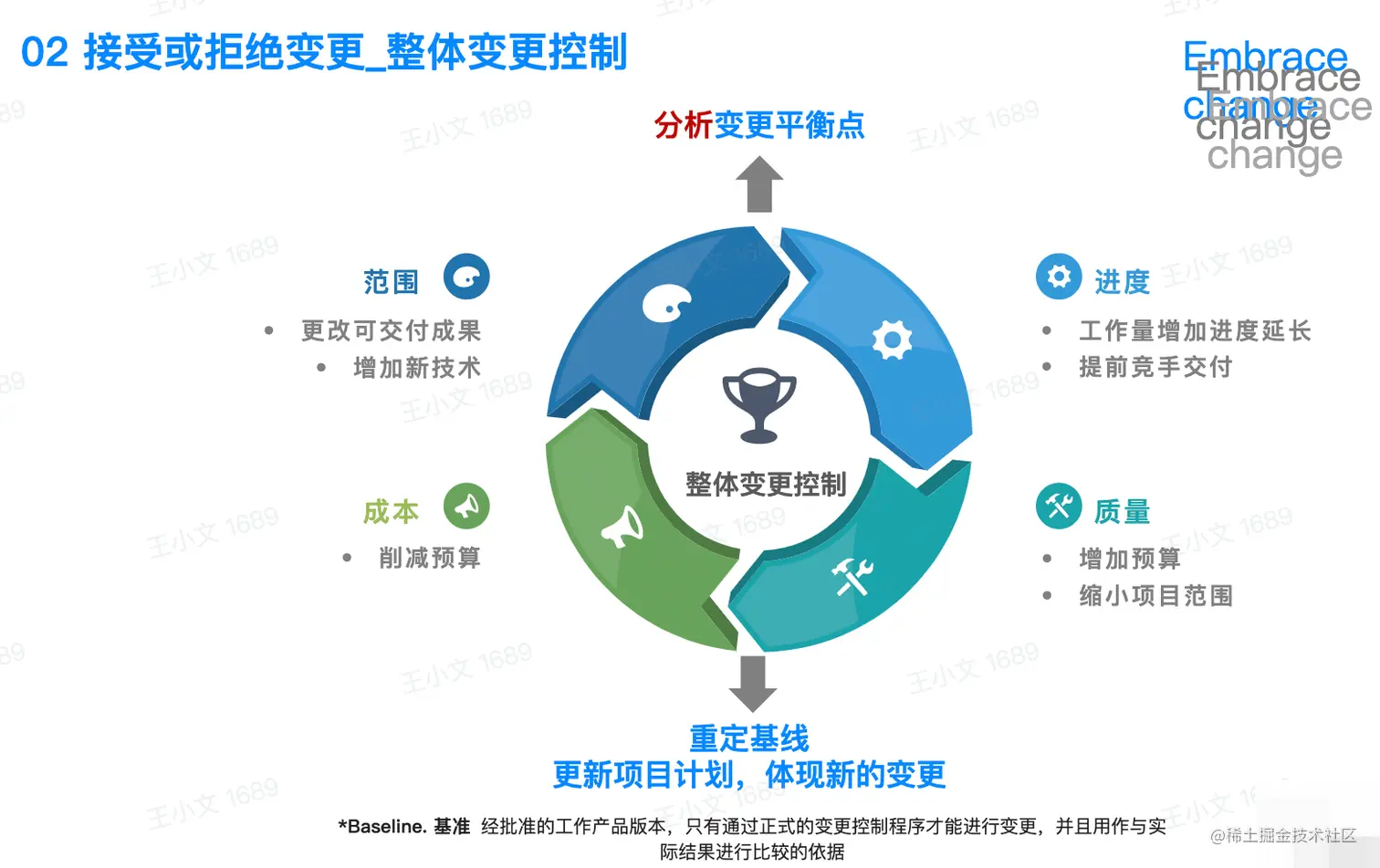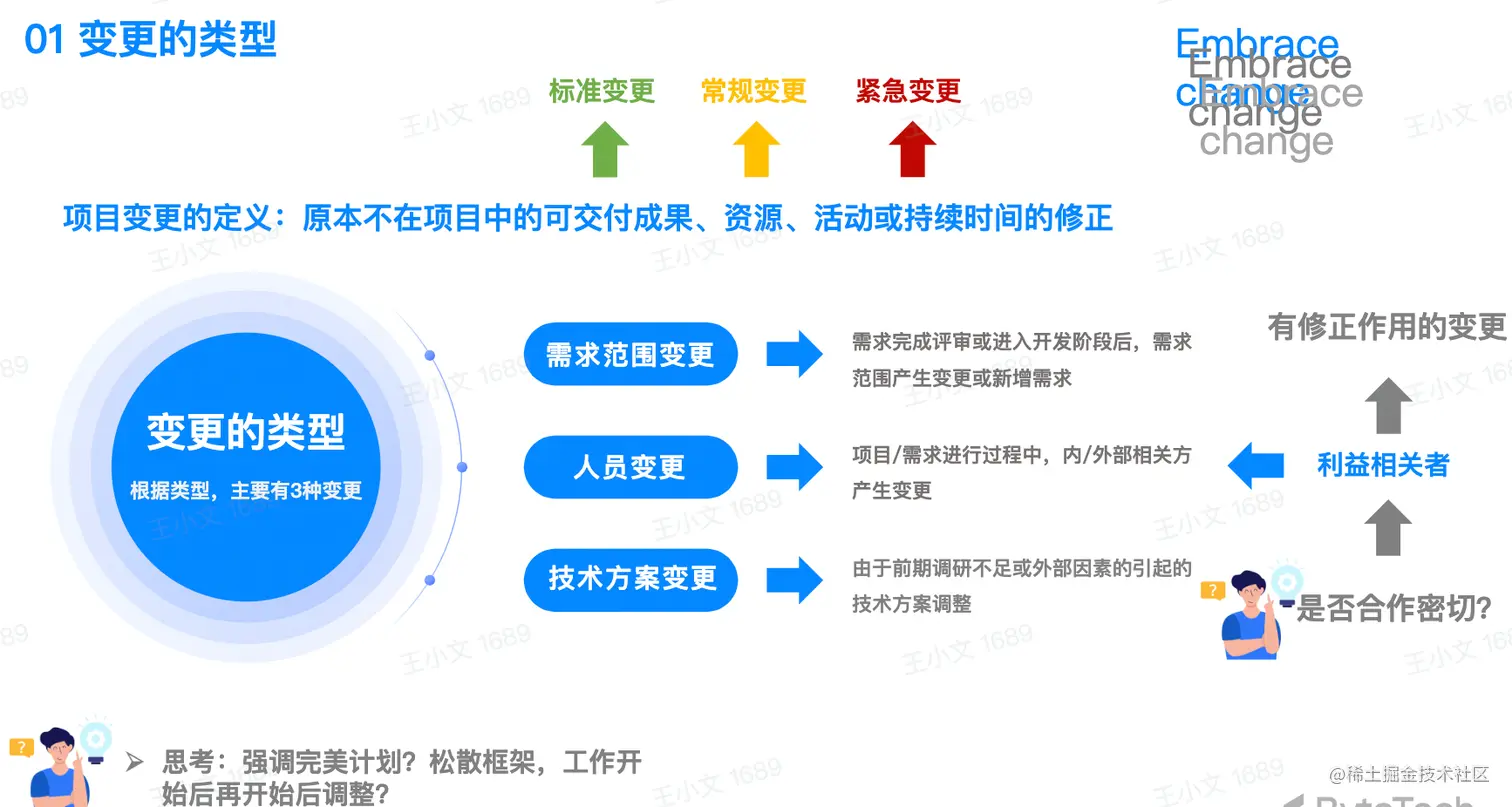 3.享受变化带来的创新的同时,避免会给你和团队带来重创的变化,如对项目成果造成影响的重大晚期变化,将变化的成本和对项目的影响降到最低;