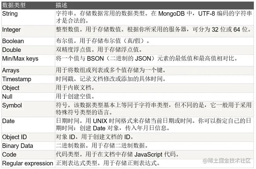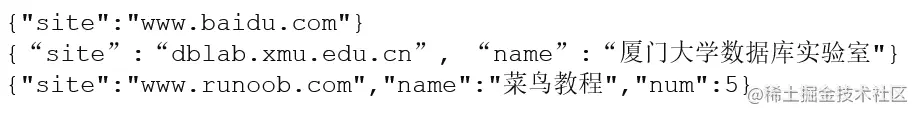 文档是一个键值(key-value)对(即BSON)。MongoDB 的文档不需要设置相同的字段,并且相同的字段不需要相同的数据类型,这与关系型数据库有很大的区别,也是 MongoDB 非常突出的特点。