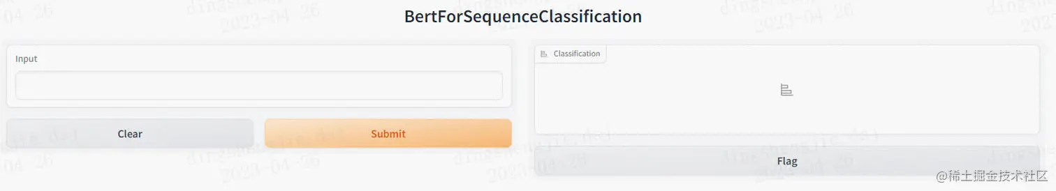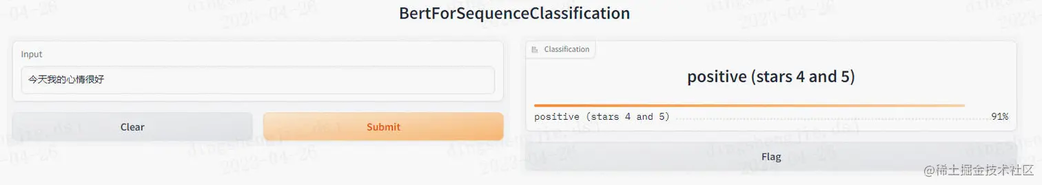 可以在左侧输入待分类文本,而后点击submit按钮,右侧便会展示出预测的标签及概率,如下图所示