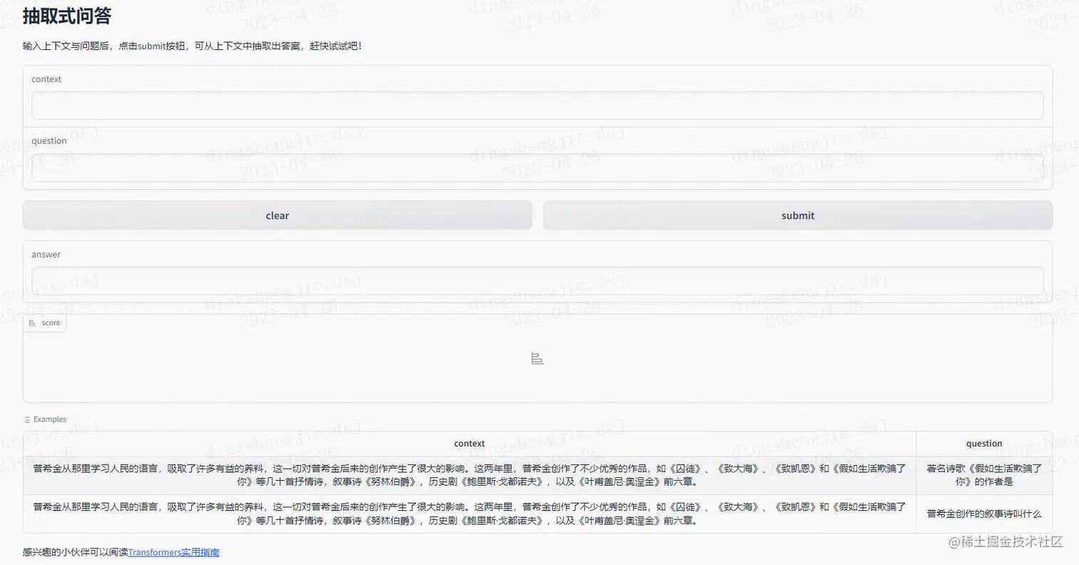 - 运行上述代码,将看到如下页面,这里的example是可以点击的,点击后将自动填充至context和question中