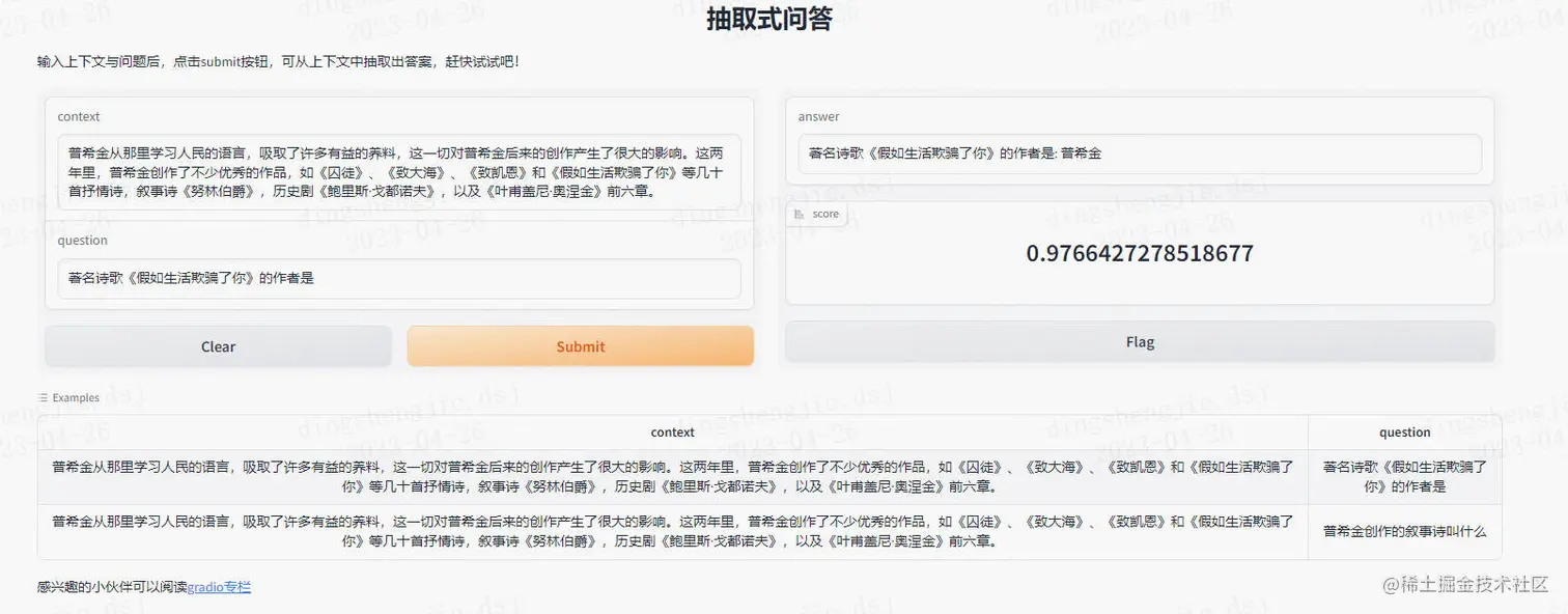 gr.Markdown("输入上下文与问题后,点击submit按钮,可从上下文中抽取出答案,赶快试试吧!")