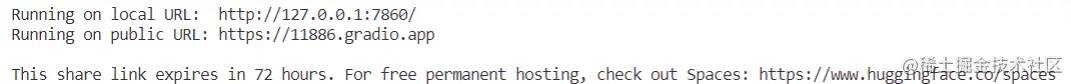 当我们的服务启动起来后,还是在本地的,虽然访问是能访问了,但是还是会受到网络的限制。Gradio提供了一种非常方便的方式,可以使得本地的服务在任何地方都可以调用。代码上,我们只需要在launch方法调用时,指定share参数值为True。服务除了有一个本地地址,还有一个公网的地址11886.gradio.app,虽然时间只有72小时