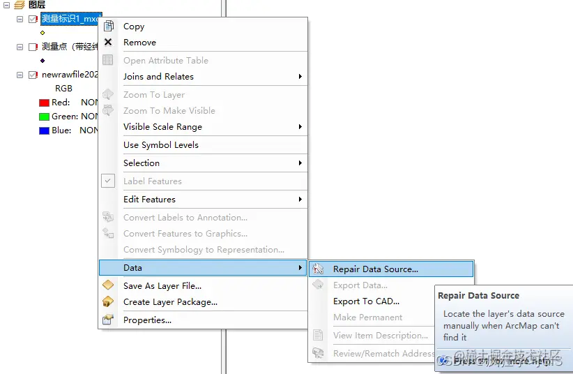 这里还有一点需要注意,由上图可以看出,我们尽管仅对测量标识1_mxd这一个图层进行了上述操作,但是整个.mxd地图文档文件所包含的三个图层都已经可以正常显示了。这是因为这三个图层的自身数据都存储在同一个路径下(在同一个文件夹里),因此当我们对.mxd地图文档文件其中的任何一个图层进行上述操作时,ArcMap软件会自动将其他同一路径下的图层也匹配起来,从而使得.mxd地图文档文件的全部图层一次性都完成了匹配。