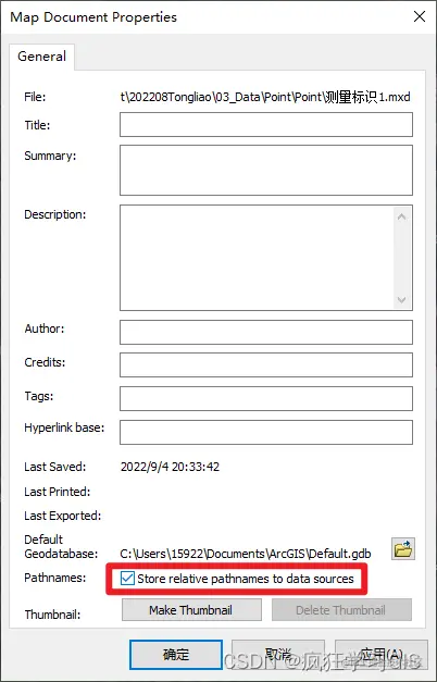 在弹出的“Map Document Properties”窗口中,选择将“Store relative pathnames to data sources”这一项选中。