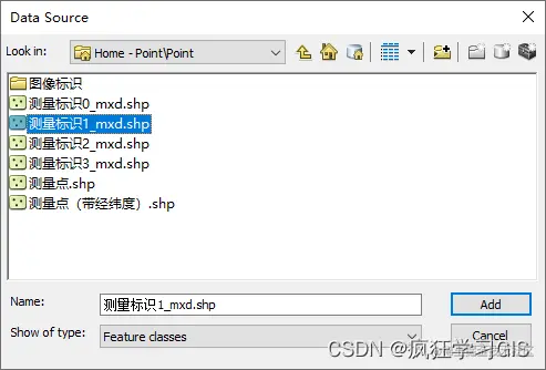 接下来,在弹出的“Data Source”窗口中,找到当前图层对应的其自身的数据文件。例如,我刚刚是在测量标识1_mxd这个图层上右键的,那么我就需要在这个窗口中找到其对应的数据文件——测量标识1_mxd.shp,并单击“Add”即可。