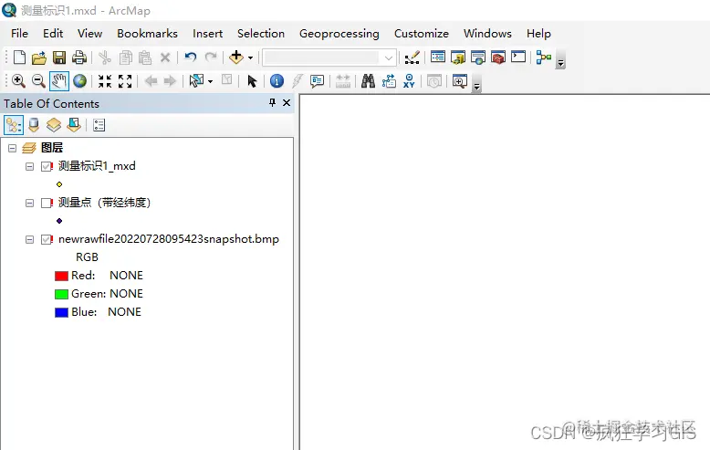 随后,可以看到测量标识1_mxd这个图层已经不再显示红色感叹号,且右侧亦可以正常显示其具体地图。