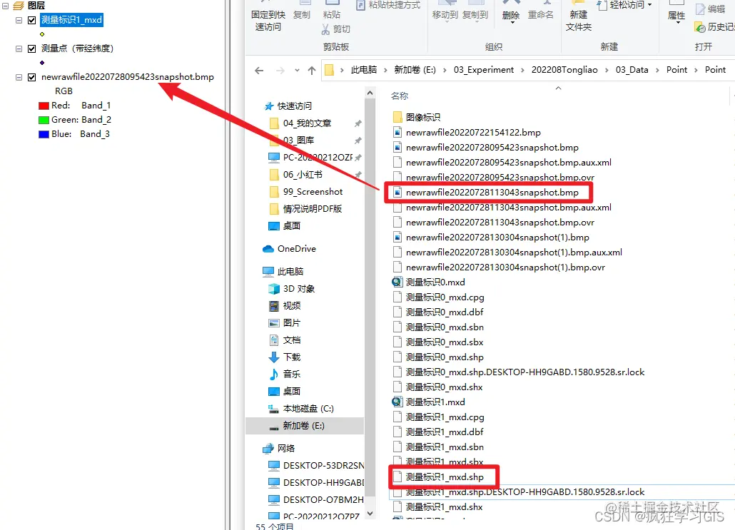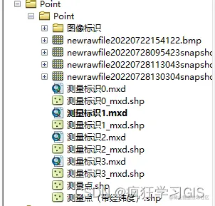 如下图所示,可以看到刚刚我们在弹出的“Data Source”窗口中不仅包含了测量标识1_mxd这个图层的数据文件测量标识1_mxd.shp,同时还包含了.mxd地图文档文件中另一个图层测量点(带经纬度)的数据文件测量点(带经纬度).shp。