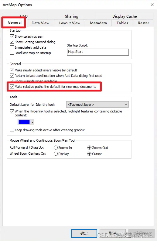 随后,在弹出的“ArcMap Options”窗口中选择“General”一栏,并将“Make relative paths the default for new map documents”这一项选中。