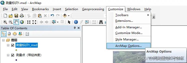 首先,第一种方法是在ArcMap软件上方选择“Customize”→“ArcMap Options...”选项。