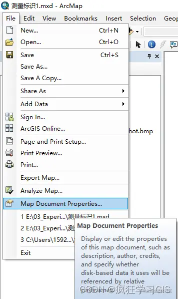此外,还有一种方法,就是在要保存.mxd地图文档文件时,选择“File”→“Map Document Properties...”选项。