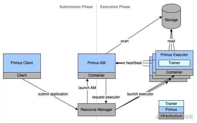 Primus Client 通过根据用户的配置,向 YARN 或 Kubernetes 集群提交 Primus Application Master(之后简称 AM)用于管理 Primus 作业集群的运行。