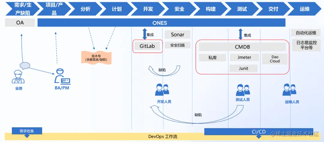 **第四,工具支持和数据驱动改进。**招商基金通过工作流引擎将需求从 OA 导入到 ONES 项目管理系统中,再利用 DevOps 工具的开放性、兼容性,将代码管理、CI/CD 等进行集成,从而打通软件开发各流程之间的壁垒,实现研发生命周期的一体化、平台化管理,提高项目的管理效率和质量。在这过程中,也通过 ONES Performance 同步收集了部分效能指标,为管理者提供全局视角,多维度评估研发管理的健康状况,定位问题,持续改进。
