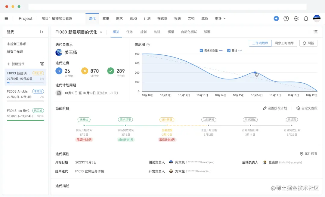 **最后一点,科学度量项目建设进展。**ONES 工作台可自定义数据范围和维度,帮助我们清晰地聚焦核心数据,随时掌控项目进度,暴露风险和问题,以便及时调整资源和计划。比如,可以通过迭代燃尽图实时跟进进度,监控目标进度的健康状态。
