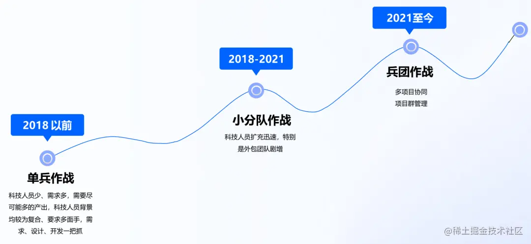 我简单介绍一下招商基金在研发管理转型中面临的主要挑战。首先看一下我司科技团队的发展历程:在 2018 年以前,我司的科技人数非常少,只有十来个人,公司要求 IT 能尽可能多地产出,因此,IT 就要求每一位研发人员都是「多面手」,需求、设计、开发一把抓,但随之而来的问题就是研发人员每个环节都不精通;在 2018-2021 年间,IT 团队增长迅速,有 50 多人,外包团队达 100 人,基本上每个项目都配置由项目经理、开发经理以及外包人员等组成的一个个开发团队;到了 2021 年,公司系统建设全面开花,各个领域都有项目在进行,IT 团队的规模也达到了 90 多人,外包团队有 200 人左右——这也意味着更多的项目协同和项目群的管理。