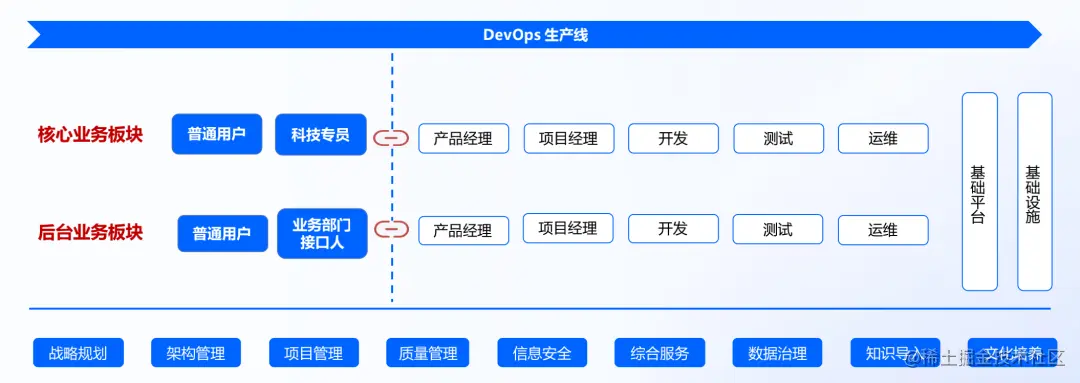 我们为什么要做研发管理?早些年前,我司就制定了公司的整体战略,围绕着「一核两擎四化」开展业务建设,「四化」的其中之一是「经营数字化」,公司明确要求信息科技要围绕核心的投资、营销、运营等领域构建公司的数字化护城河,提高工作效能。公司对 IT 的要求就更加明确,从原来的「服务业务」转变为「赋能业务」,甚至是希望在某方面「引领业务」。