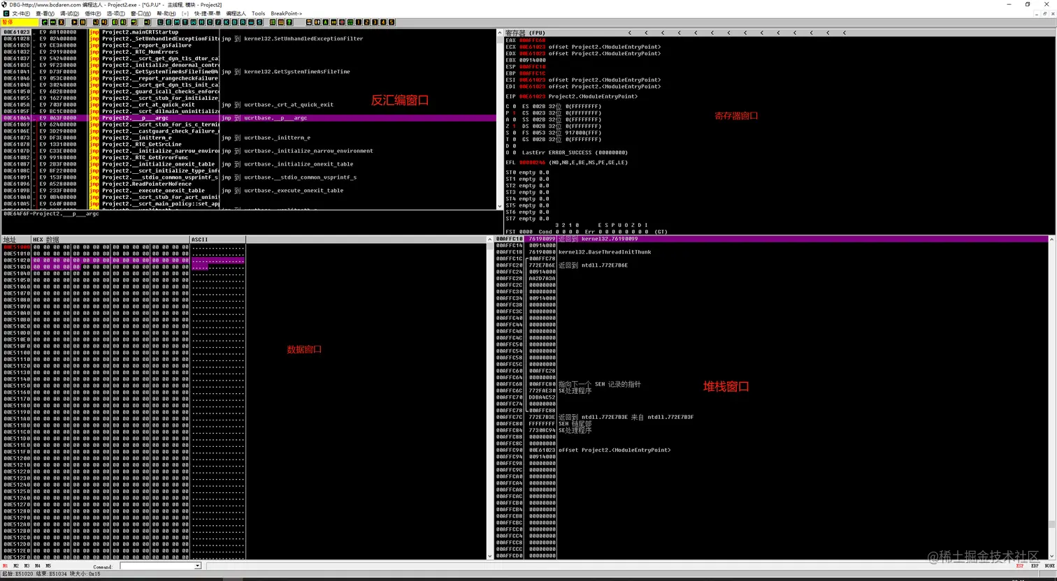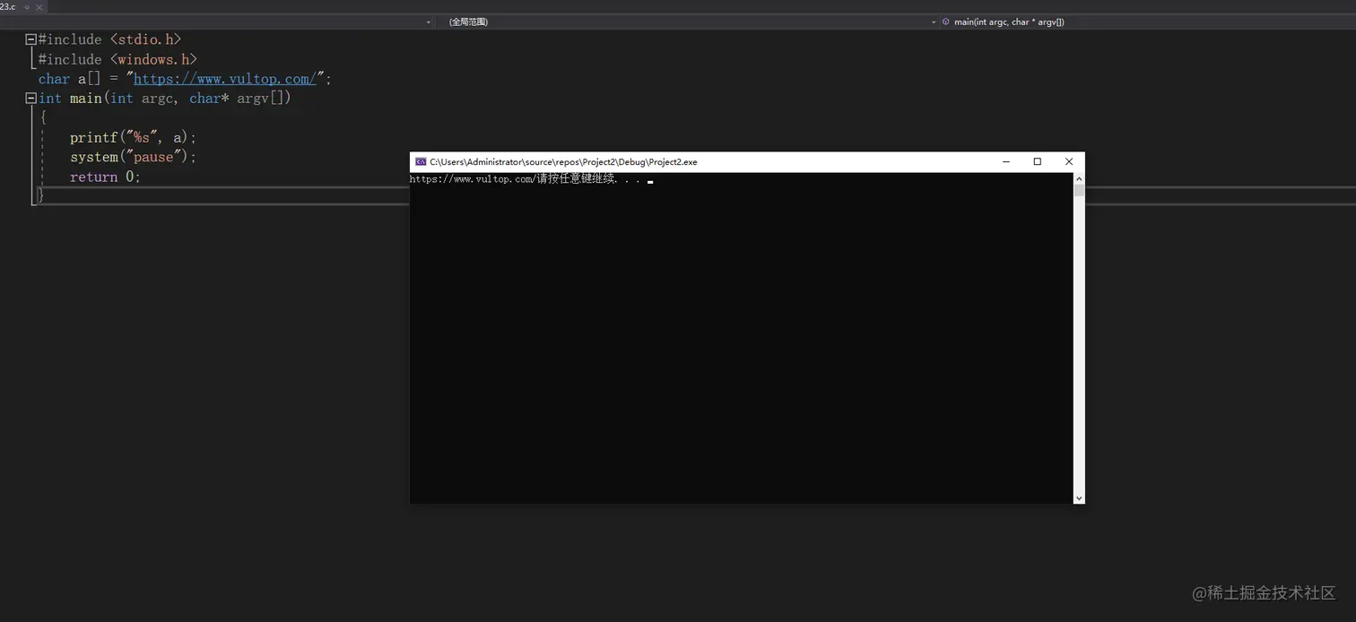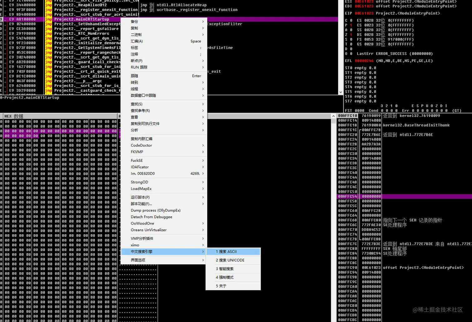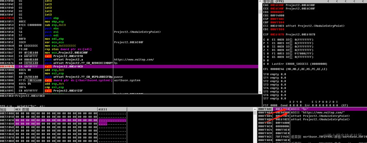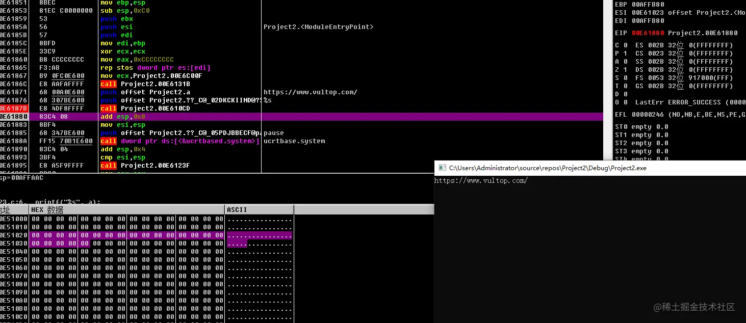 这俩款工具都是动态调试工具,使用方式也大致相同,唯一区别的OD属于经典款,各种功能插件及其全面好用,唯一不足就是没有64位版本,而x96dbg分x32dbg和x64dbg,支持64位,但是他的插件没有OD那么完善。我们用Visual Studio 2019编写一个demo,拖入OD中分析(32位):