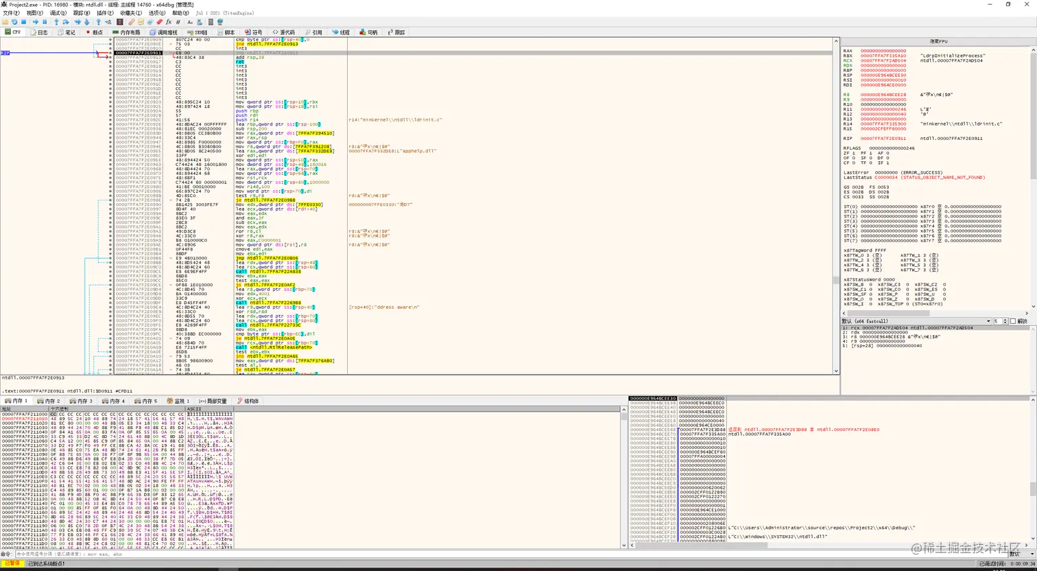 接下来我们把demo改成64位,拖入x64dbg,大同小异,和OD用法基本一样: