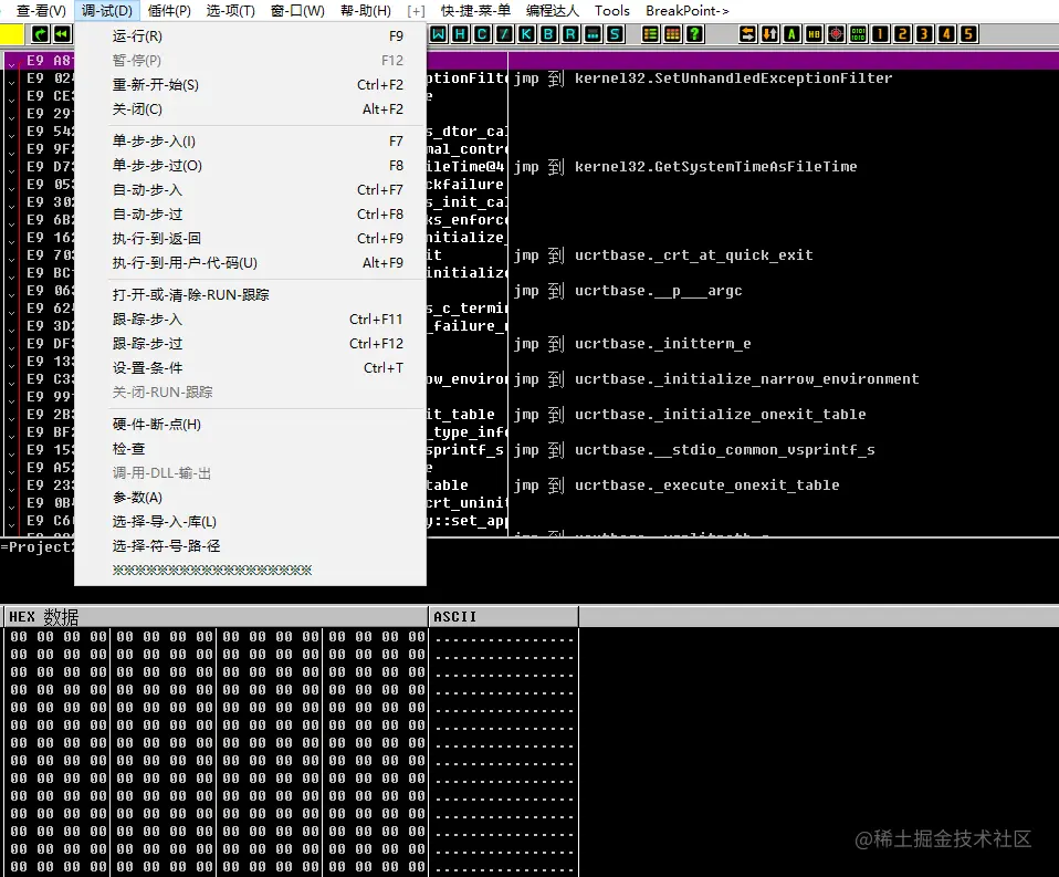 常用到的就是F7单步步入,比如走到一个call指令,F7会跟进call内部函数,F8单步步过则会跳过call内函数,执行到call下一行,F4是运行到当前光标位置,F9是让程序运行,Ctrl+F9是执行到当前call的返回地方ret指令。