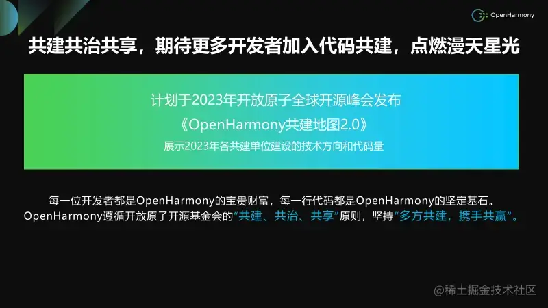 OpenHarmony遵循开放原子开源基金会的“共建、共治、共享”原则,坚持“多方共建,携手共赢”,工作委员会计划于2023年开放原子全球开源峰会上发布《OpenHarmony共建地图2.0》,欢迎更多开发者加入OpenHarmony代码共建,共同繁荣OpenHarmony技术底座,点燃漫天星光。
