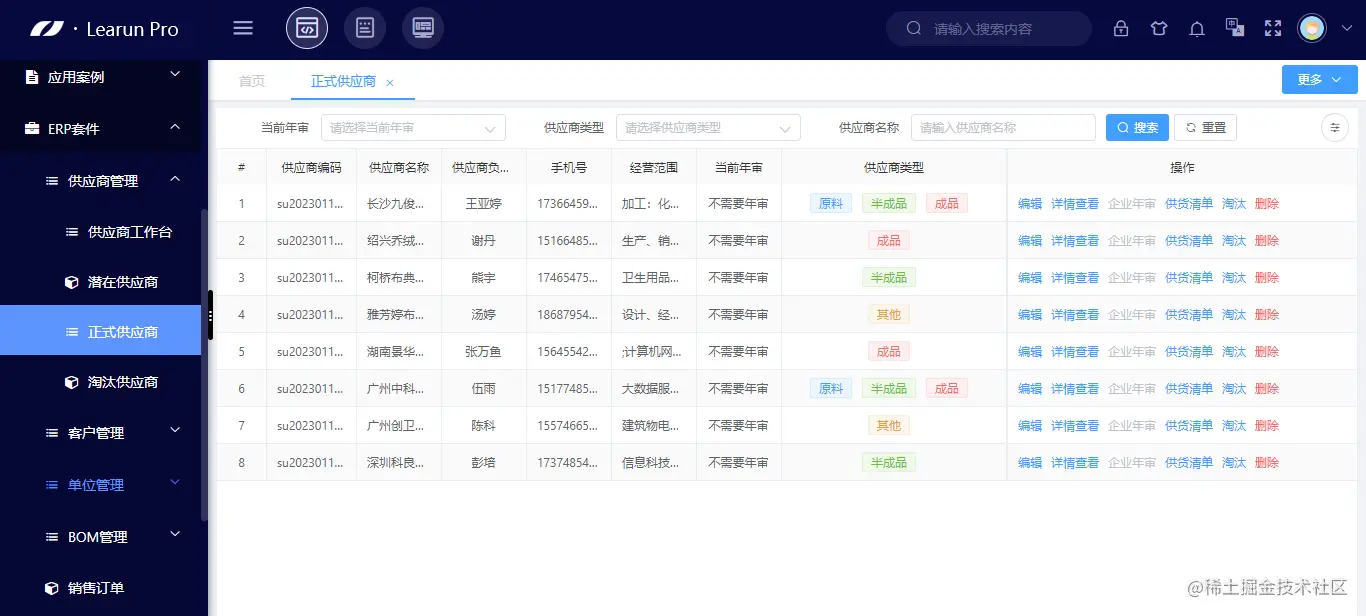 供应链管理的业务重点之一就是管理供应商网络。LeaRun敏捷开发平台供应商管理模块对供应商供货业务资料的记录和控制信息进行了比较完善的管理,包括对不同供应商、 不同物料、不同数量段价格进行了详细记录,从潜在供应商转为合格供应商,到供应商管理,合同、订单、交付、对账结算等采购全流程全周期把控,打破“数据孤岛”,供应链平台利用数据集成精准决策,实现采购管理高效运作,可助力企业轻松管理供应商。