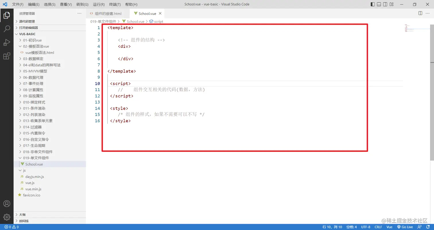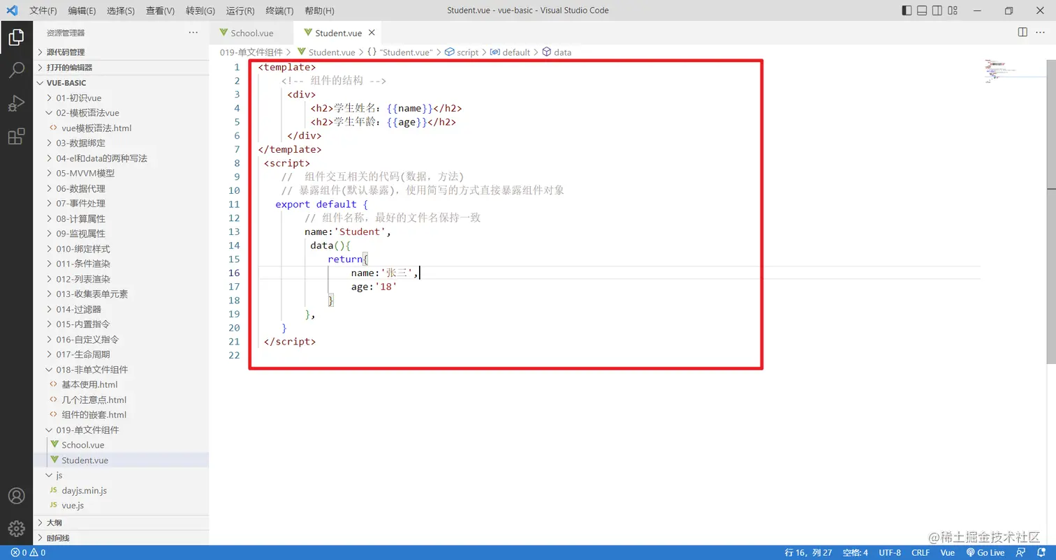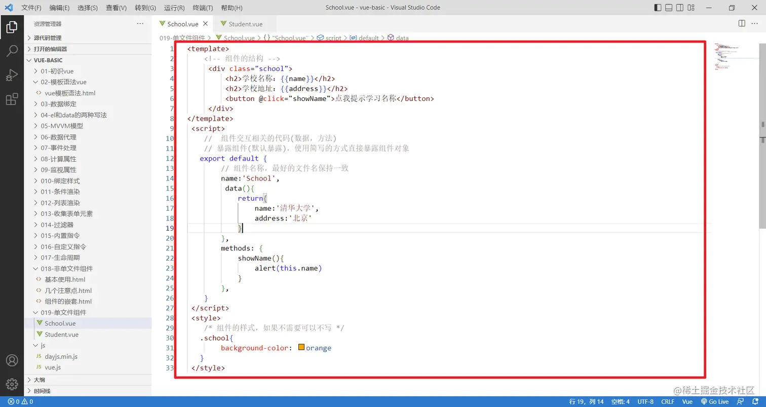 接下来就开始编写单文件组件了,首先创建一个学校组件(School.vue)