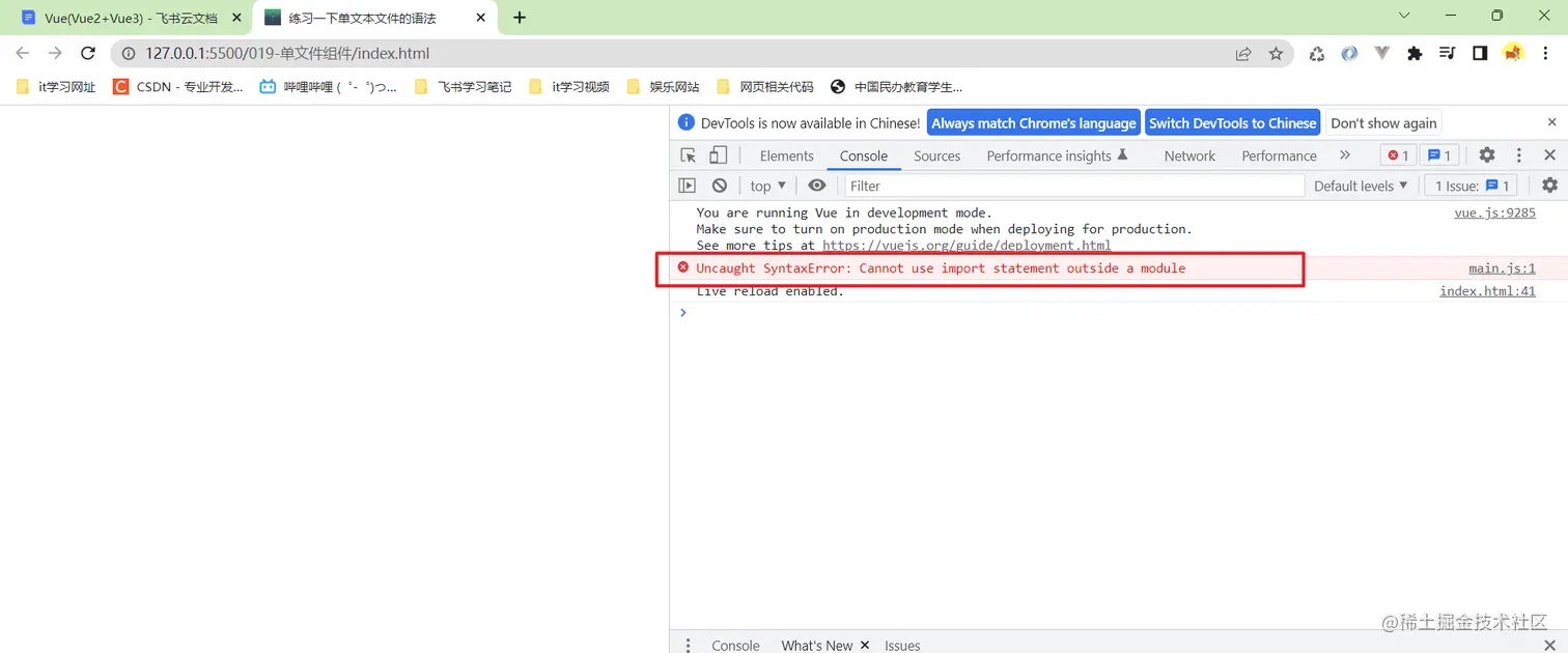 全部写好之后就可以打开文件在浏览器上查看,发现报错了,浏览器不能直接支持ES6的模板化语法