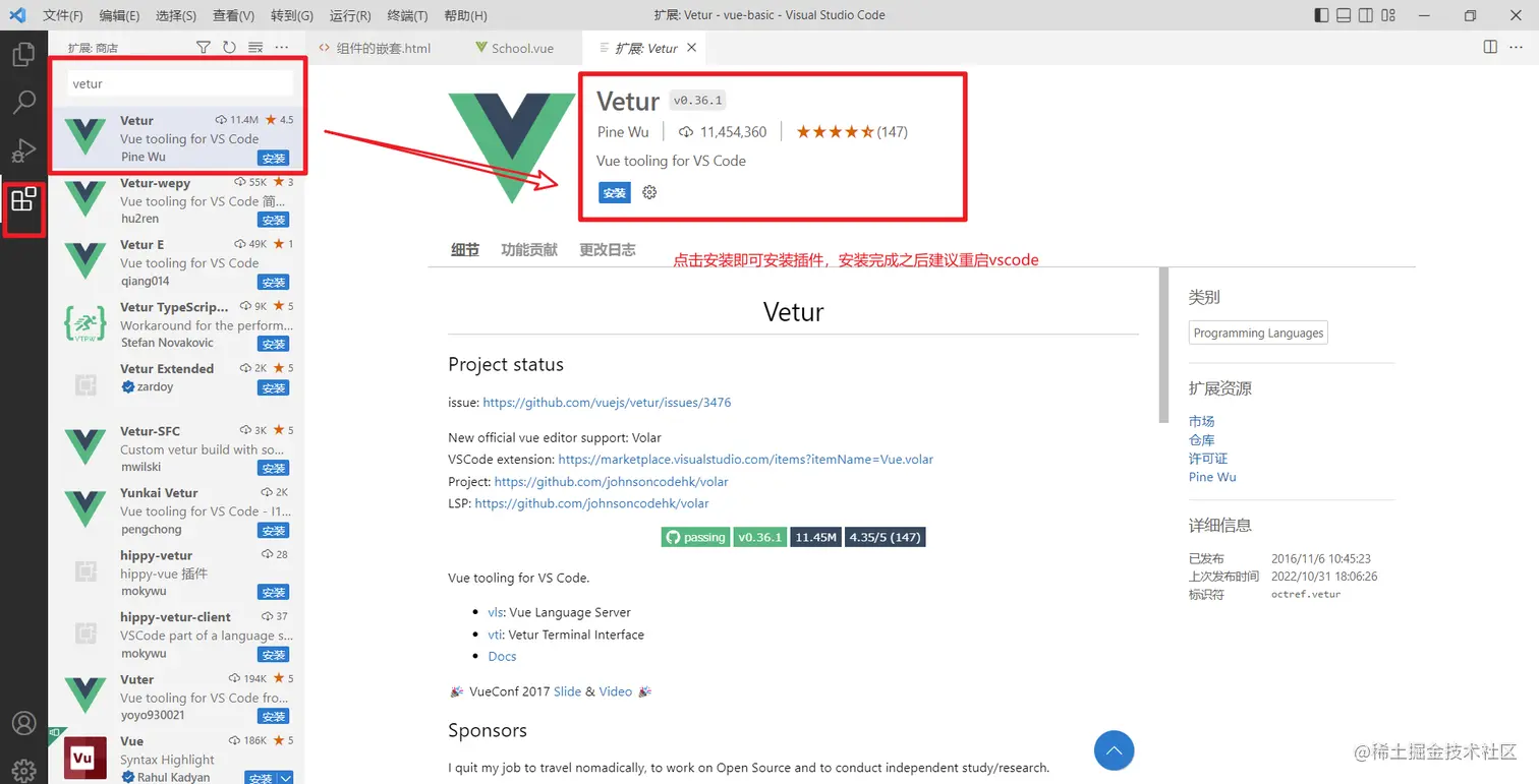 安装步骤很简单,打开vscode,插件里面搜索vetur,点击安装即可,安装完成后建议重启vscode