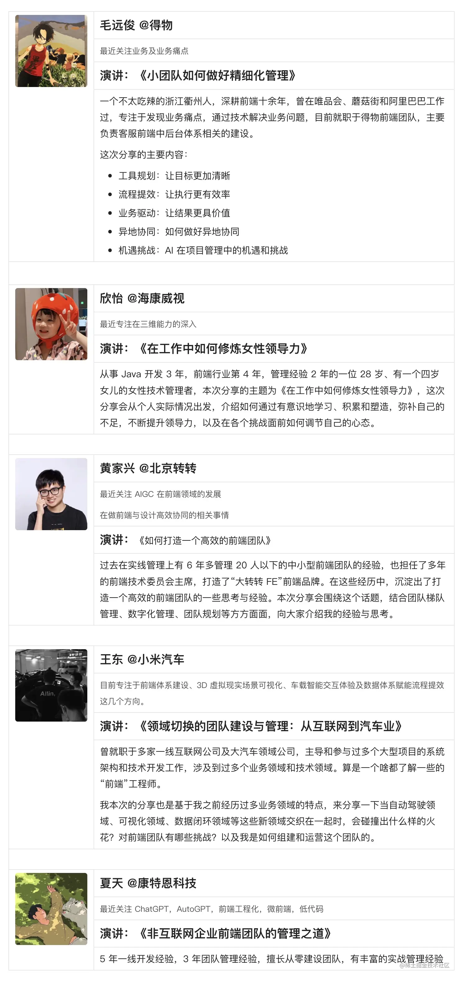 大会本次邀请 5 位前端团队负责人,管理经验从 2 年到 10 年不等,管理团队的人数从几个到几十个人不等,通过 5 场干货分享,希望一次性解决这些困惑 - 前端如何搞「 管理 」,报名用力戳:www.zaozao.run/conf/c64。