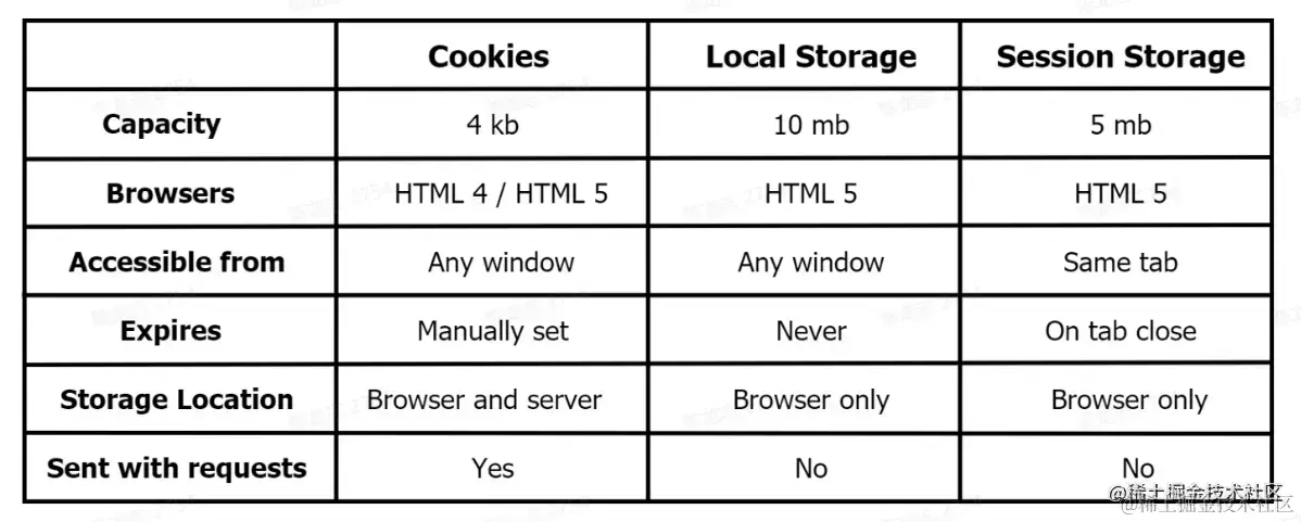 数据与服务器之间的交互方式,cookie的数据会自动的传递到服务器,服务器端也可以写cookie到客户端; sessionStorage和localStorage不会自动把数据发给服务器,仅在本地保存。