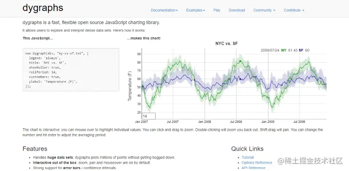 Dygraphs 非常适合处理大量数据,能够轻松精确地绘制数百万个点。提供了许多自定义选项。高度可定制,开箱即用的交互式。