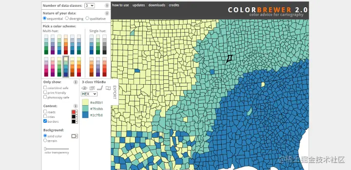 Colorbrewer 是一种基于同行评审研究的流行在线工具,可帮助制图师和数据科学家选择最佳的颜色组合来可视化他们的数据。