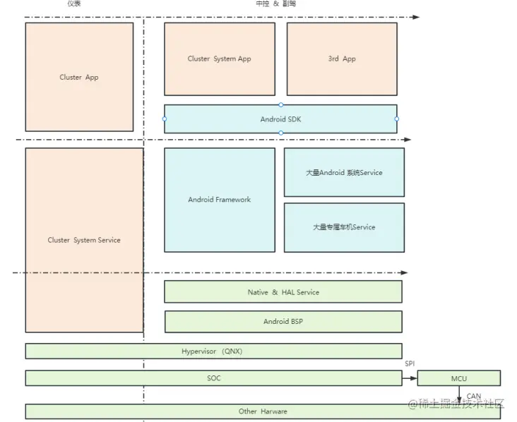 这么多service看的眼睛都花了,不过确实是在这里面管理添加并缓存的,并且Car还把硬件抽象相关的vehicle传过来了,那各种服务拿到这个硬件接口,不就是可以操作硬件了嘛。以上就是carservice的启动过程。用一张图来表述各个功能模块