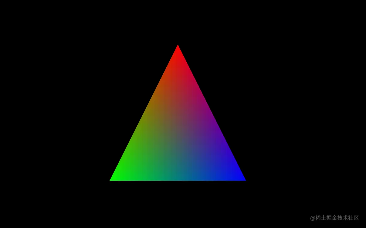 顶点位置成功传递,顶点颜色在顶点位置的基础上扩展即可。首先,在每个顶点坐标后跟上一个颜色值,例如上面的代码就是分别把红绿蓝三种颜色给到一个顶点,然后就是修改buffers[0] 的 arrayStride,现在一个顶点已经有 5个 f32 了,其次这个 5 个 f32 表示了位置和颜色两个属性,所以我们需要在 attributes 中清楚地描述出来,每个属性都占用一个不同的 shaderLocation,另外还需要注意 color 属性是从第三个数开始的,所以它需要偏移 8 个字节。好了,顶点颜色成功添加进入 GPUBuffer 啦,现在再修改一下着色器就可以了。