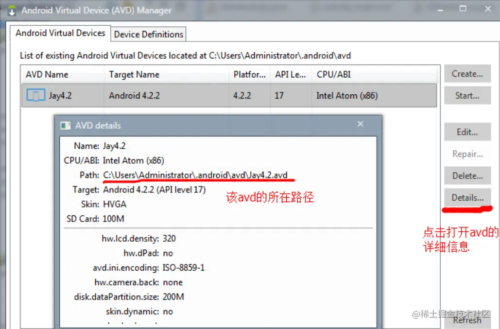 对于旧版本的sdk或者其他原因可能需要手动关联下sd卡,设置如下:①找到创建好的avd的镜像的路径:点击打开avd界面,点击detail,查看avd镜像的目录下