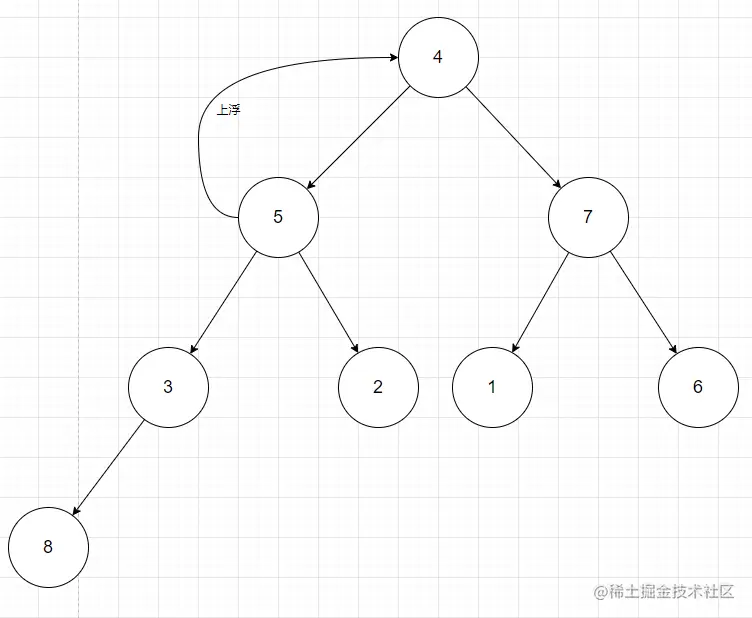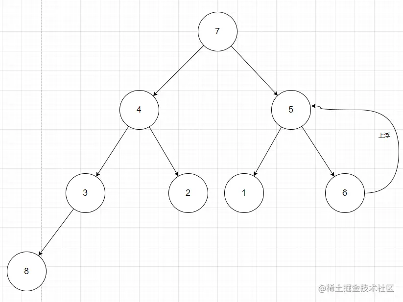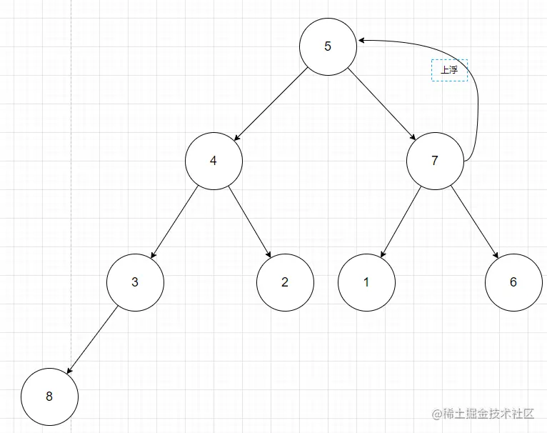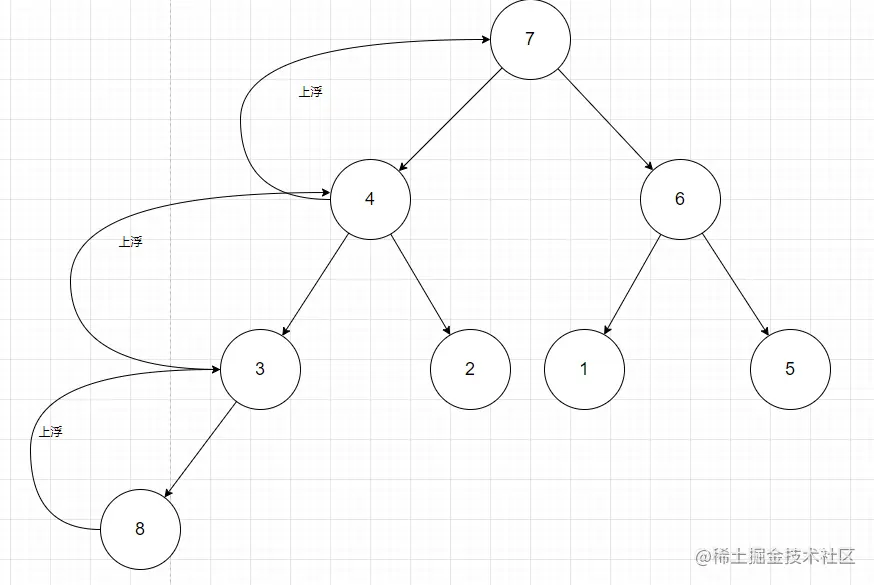 上浮是从堆顶开始,不断的循环判断自己和父节点的值,如果大于了父节点,那么父节点就不配做父节点,自己就得上浮替代父节点。