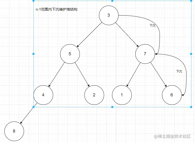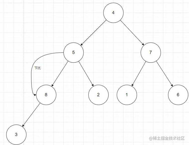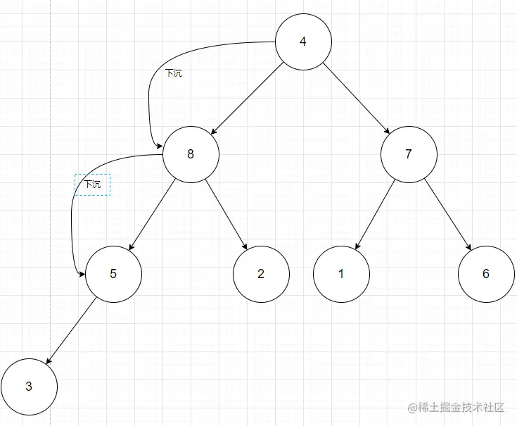 下沉是从堆底的父节点开始,不断判断自己和左右子树的节点值,如果小于就得下沉父节点作子节点。